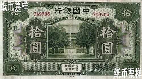 | 各地地名國幣券 | 拾圓 | 漢口 | 正面為山東曲阜孔廟大成殿圖;背面為花紋圖案 | 正面為深綠色,背面為紫色 | 96×175 | 美國鈔票公司 | 正面為“民國七年”背面為“SEPTEMBER 1918” |