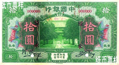 | 各地地名國幣券 | 拾圓 | 四川 | 正面為山東曲阜孔廟大成殿圖;背面為花紋圖案 | 正面為棕色,背面為棕色 | 96×175 | 美國鈔票公司 | 正面為“民國七年”背面為“SEPTEMBER 1918” |