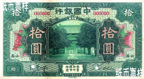 | 各地地名國幣券 | 拾圓 | 山西 | 正面為山東曲阜孔廟大成殿圖;背面為花紋圖案 | 正面為橄色,背面為橄色 | 96×175 | 美國鈔票公司 | 正面為“民國七年”背面為“SEPTEMBER 1918” |
