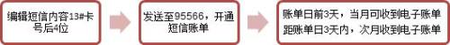 2.您可編輯手機短信13#卡號后4位,發(fā)送至95566,開通短信賬單。