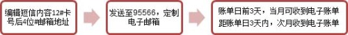 1. 您可編輯手機短信12#卡號后4位#郵箱地址,發(fā)送至95566,添加/修改電子郵箱。