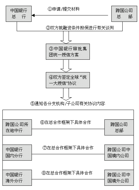 3.統(tǒng)一操作。統(tǒng)一談判:由中國銀行總行代表全球分支機(jī)構(gòu),跨國集團(tuán)總部代表全球子公司,統(tǒng)一談判授信條件、授信方式及合作細(xì)節(jié)。統(tǒng)一擔(dān)保:由跨國集團(tuán)總部提供統(tǒng)一的信用保證;統(tǒng)一評(píng)估:由中國銀行總行統(tǒng)一對(duì)跨國集團(tuán)的整體資信進(jìn)行評(píng)估與認(rèn)定;統(tǒng)一實(shí)施:根據(jù)雙方談判結(jié)果,由中國銀行總行及總分支機(jī)構(gòu)據(jù)此操作對(duì)跨國集團(tuán)總部及當(dāng)?shù)刈庸镜氖谛艠I(yè)務(wù)。