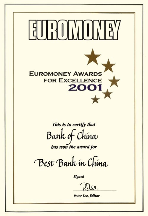 In the July 2001 issue of the Euromoney, Bank of China was named as the "Best Bank (China)".