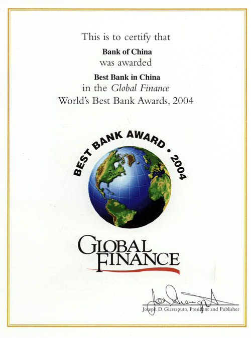 In the May 2004 issue of the Global Finance, Bank of China was named as the "Best Bank in China".