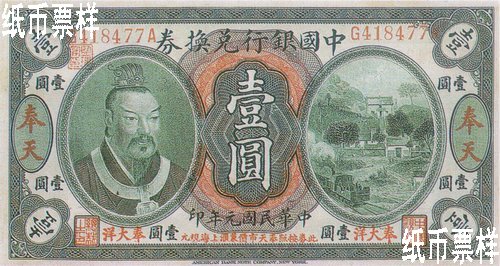 The Front of One-Yuan Fengtian Local Redeemable Note Bearing the Portrait of Emperor Huang Di