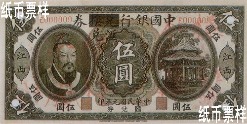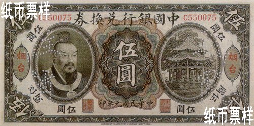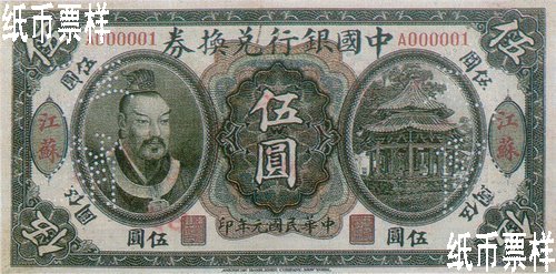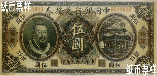 The portrait of Emperor Huang Di printed on the left of the front side and the picture of octagonal pavilion with double-hipped roof on the right; the landscape of bridge and trees printed on the back |