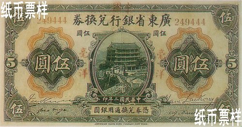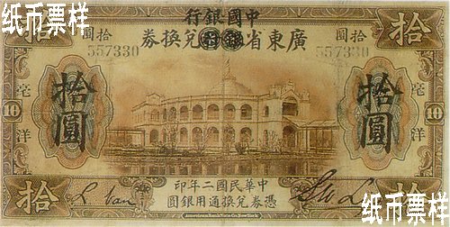 Bank of China (BOC) Guangdong branch issued redeemable notes used as subsidiary silver coin notes in August, 1914. These notes, with the denominations of five yuan and ten yuan, were BOC redeemable notes in substitution for the redeemable notes (1913) of Guangdong Provincial Bank printed by American Bank Note Company.