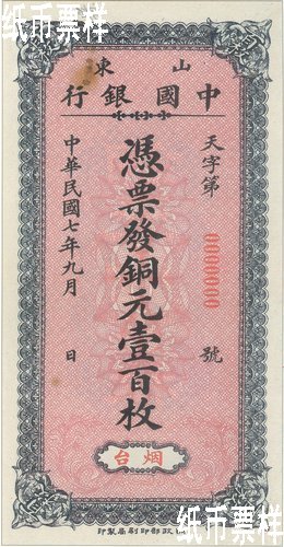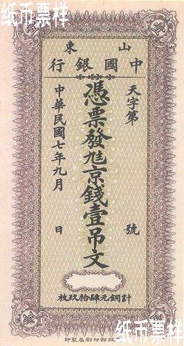 In 1918, Shandong Province witnessed the circulation of copper cash notes in one thousand stringed cash, two thousand stringed cash and five thousand stringed cash, as well as the lengthwise copper coin note with the denomination of 100 copper coins, which were printed by the Bureau of the Engraving and Printing of Ministry of Finance.