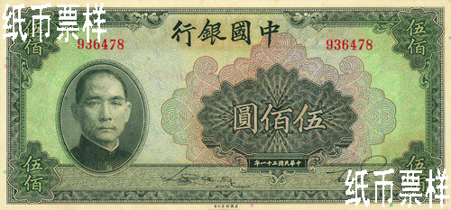 Legal tender note bearing the portrait of Sun Yat-sen 500yuan The portrait of Sun Yat-sen printed on the front; the scene of the Hall of Prayer for Good Harvest in Temple of Heaven on the back Gray-green on both sides 89×191 American Bank Note Company "The 31st Year of the Republic of China" on the front and "1942" on the back