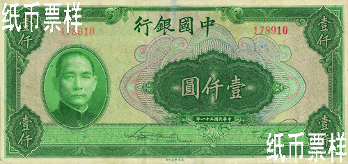 Legal tender note bearing the portrait of Sun Yat-sen 1000yuan The portrait of Sun Yat-sen printed on the front; the scene of the Hall of Prayer for Good Harvest in Temple of Heaven on the back Green on both sides 93×197 American Bank Note Company "The 31st Year of the Republic of China" on the front and "1942" on the back