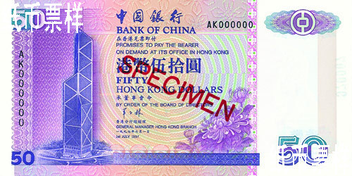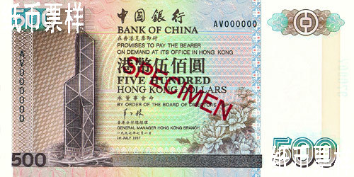 From 1994 to 1999, Bank of China issued Hong Kong notes in HKD 20, 50, 100, 500, and 1,000 printed by Thomas De la Rue (Hong Kong) and Hong Kong Note Printing Limited.