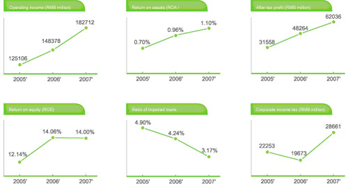 Bank of China makes constant effort to improve the capability of creating values for shareholders. From 2006 to 2007, the operating income increased from RMB 148,378 million to RMB 182,712 million, the after-tax profit increased from RMB 48,264 million to RMB 62,036 million, the ratio of impaired loans decreased from 4.24% to 3.17%, the return on average equity was 14%, and the return on assets (ROA) increased from 0.96% to 1.10%.