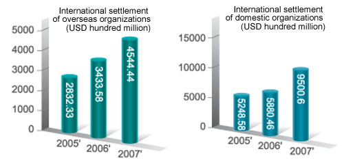 The international settlement of domestic and overseas organizations reached USD 1.4 trillion in 2007, making the bank the first commercial bank in the world with annual international settlement exceeding USD 1 trillion.