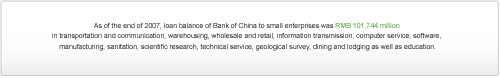 Bank of China strives to help customers improve life quality by providing multiple financial services. By the end of 2007, the Bank had issued home loans totaling RMB 850,760 million to 3.86 million individual customers and auto loans totaling RMB 157,516 million to 1.18 million customers.