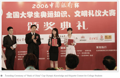 Bank of China has launched various Olympic-themed events for different populations as of the end of 2005: the National Olympic Summer Camp for Youth for two consecutive years; the sponsoring of Olympic Knowledge and Etiquette Contest for College Students; Shanghai Olympic Games Festival, Beijing Olympic Long Walk and Hangzhou Olympic Games Festival for promoting nationwide fitness; themed events in Tianjin for entitling the disabled to Olympic experience; and the "Youth Civilization" events for welcoming the Olympic Games in communities, and so on.
