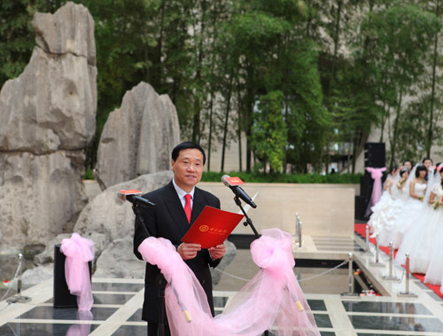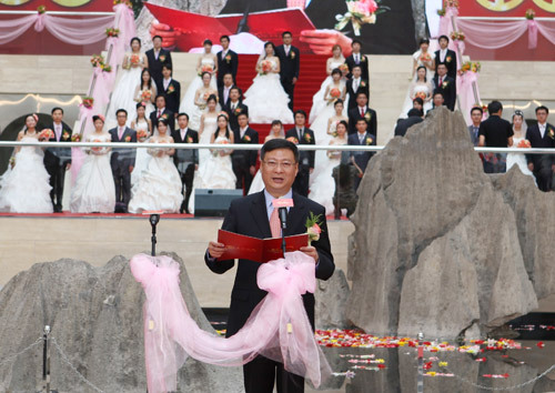 The wedding formally began at 10:08 in the morning. Following a warm and touching video clip named Blueprint of Love, 50 dressed-up couples waltzed onto the stage as the melody turned on. In the following sections such as Thanksgiving of Love and Commitment to Love, the newlyweds respectively shared their love stories that took place during working for the project, exchanged rings, and accepted blessings from their parents, leaders and guests. Xiao Gang, Chairman of Bank of China, and Li Lihui, President of Bank of China, respectively serving as the officiator and chief witness of the wedding ceremony, presented the newlyweds with special commemorative cards, implying a meaning of "deposits of love for a lifelong treasure".