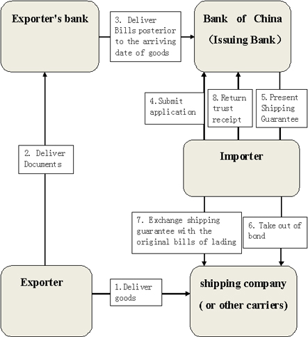 3. The importer picks up the goods from shipping company (or other carriers) by presenting shipping guarantee issued by Bank of China.