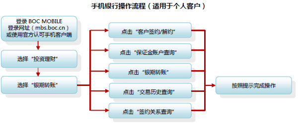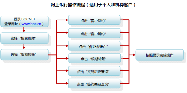 第二步:請(qǐng)您按照我行網(wǎng)銀BOCNET個(gè)人服務(wù)申請(qǐng)受理流程申請(qǐng)我行BOCNET理財(cái)版?zhèn)€人服務(wù),開(kāi)通網(wǎng)銀服務(wù)后,您可登錄我行網(wǎng)銀系統(tǒng)自助開(kāi)通投資服務(wù),選擇銀期轉(zhuǎn)賬——簽約,并在線確認(rèn)簽署《中國(guó)銀行銀期轉(zhuǎn)賬服務(wù)協(xié)議書(shū)》(個(gè)人投資者網(wǎng)銀適用),開(kāi)通銀期轉(zhuǎn)賬服務(wù)。