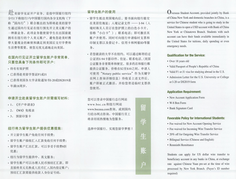 中國(guó)銀行紐約分行及紐約皇后分行為即將赴美求學(xué)的留學(xué)生,提供全新的“美好前程”留學(xué)見(jiàn)證開(kāi)戶產(chǎn)品套餐。該產(chǎn)品套裝包括美元有息支票賬戶、銀行卡、支票、網(wǎng)上銀行一攬子產(chǎn)品服務(wù),具備靈活的美國(guó)境內(nèi)資金劃轉(zhuǎn)和支付功能。留學(xué)生可通過(guò)中國(guó)銀行境內(nèi)分支機(jī)構(gòu)(不含在我國(guó)香港特別行政區(qū)、澳門特別行政區(qū)及臺(tái)灣地區(qū)的分支機(jī)構(gòu))見(jiàn)證申請(qǐng)產(chǎn)品服務(wù),出國(guó)前就獲得美國(guó)當(dāng)?shù)劂y行卡、臨時(shí)支票、網(wǎng)上銀行。個(gè)人支票和銀行卡能輕松滿足大額學(xué)費(fèi)支付和日常消費(fèi)需求,網(wǎng)上銀行具備便捷查詢賬戶交易和匯款轉(zhuǎn)賬等功能,足不出戶即可輕松管理您的境外賬戶。
